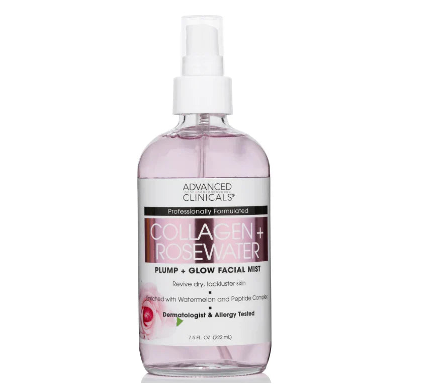 Advanced Clinicals Collagen + Rosewater Facial Mist – A refreshing facial spray infused with collagen, rosewater, watermelon, and peptides to hydrate, plump, and revive dull, dry skin.