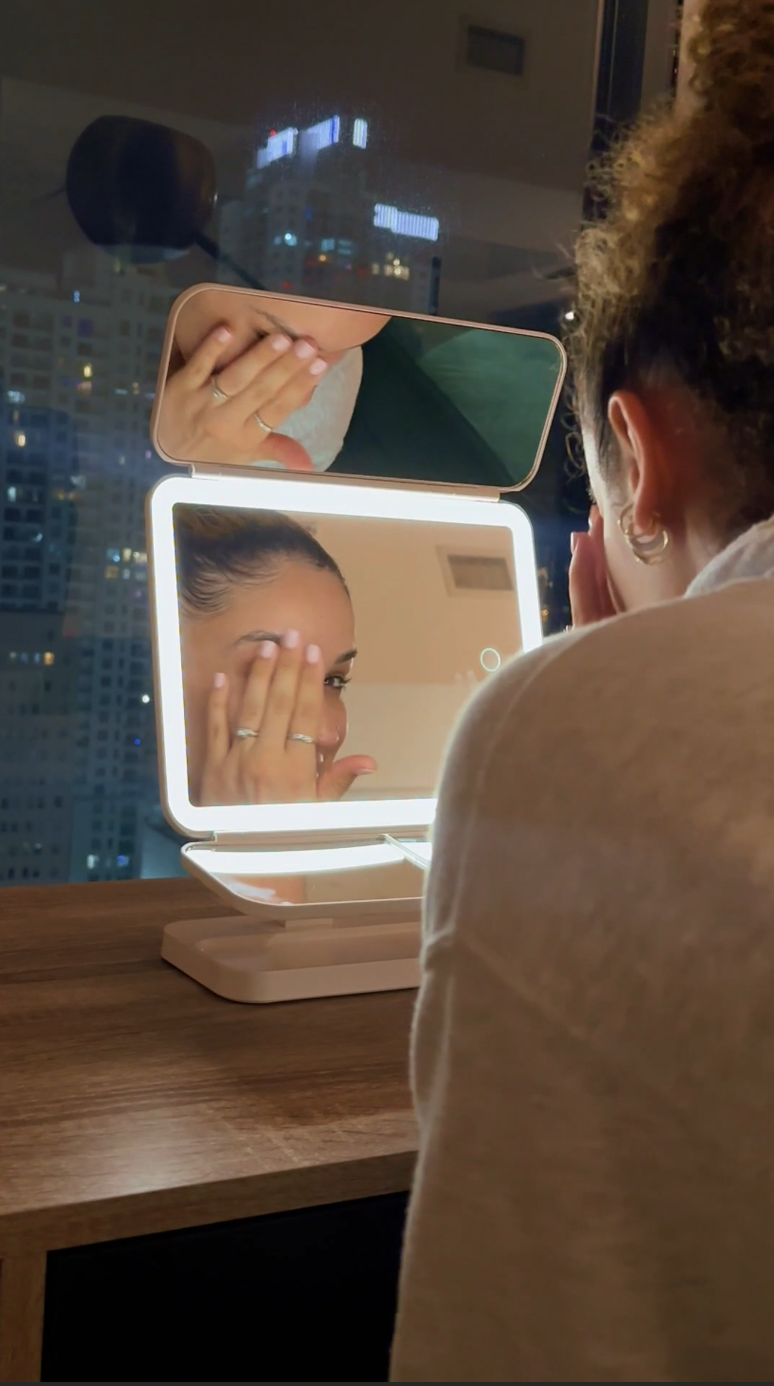 Unfold the trifold mirror and tilt it to your ideal angle. Tap the smart-touch buttons to switch between warm, daylight, and cool lighting based on where you’re going. Use the magnifying panels for precision tasks like brows, blending, and lashes.